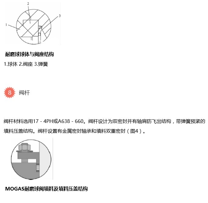 球體為不銹鋼410SS,表面高速氧火焰噴涂碳化鉻合金(涂層耐溫815℃),硬度64HRC以上,厚度不小于0.3mm。閥座為Inconel718合金,同樣采用噴涂碳化鉻合金硬化處理。表面高速氧火焰噴涂碳化鉻合金再熔融處理(耐溫815℃),涂層耐磨不易脫落。球面硬度64HRC以上,厚度不小于0.3mm。球體與閥座手工配對研磨,密封檢驗完全滿足API598標準要求。閥座鋒利的邊緣可對球體自刮擦自清潔,防止介質進入球體與閥座的密封面而造成內漏和卡塞現象。