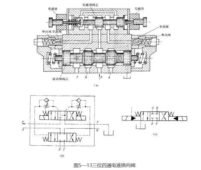 圖5-13所示為電液換向閥的結構圖和圖形符號圖。當電磁閥左端電磁鐵通電時,電磁閥閥芯被推向右端(左位接通),控制壓力油通過電磁閥流入液動閥閥芯的左端,推動液動閥閥芯向右移動,其右端的油液經電磁閥回油箱,此時主油路P口與A口接通,B口與T口接通。反之,電磁閥右端電磁鐵通電時,控制壓力油經電磁閥進入液動閥閥芯的右端,推動液動閥閥芯向左移動,其左端油液經電磁閥回油箱,使主油路P口與B口接通,A口與T口接通。如電磁閥左、右電磁鐵均斷電,則電磁閥閥芯處于中位,控制壓力油被阻斷,不能進入液動閥,且因電磁閥的中位機能為Y型特性,使液動閥兩端的油液均經電磁閥中位泄回油箱,因此液動閥也在其兩端彈簧的作用下處于中位,主油路P、T、A、B口均不相通。